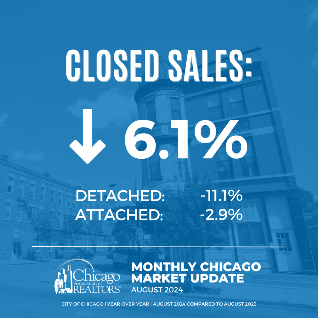 - 2,105 properties were sold in the City of Chicago in August 2024. This is a 6.1% decrease from August 2023.
