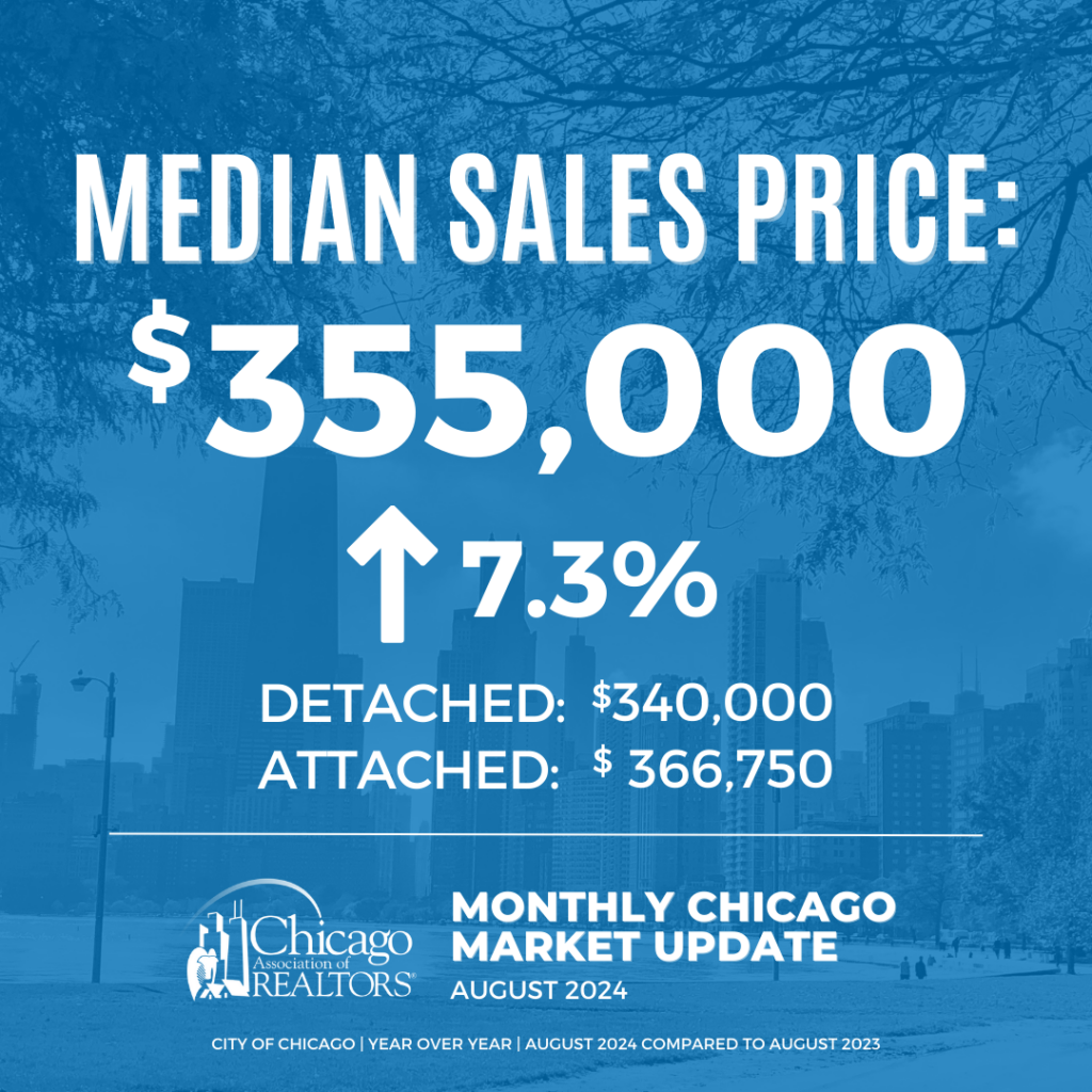 - The median sales price in the City of Chicago for August 2024 was $355,000, which is a 7.3% increase from August 2023.