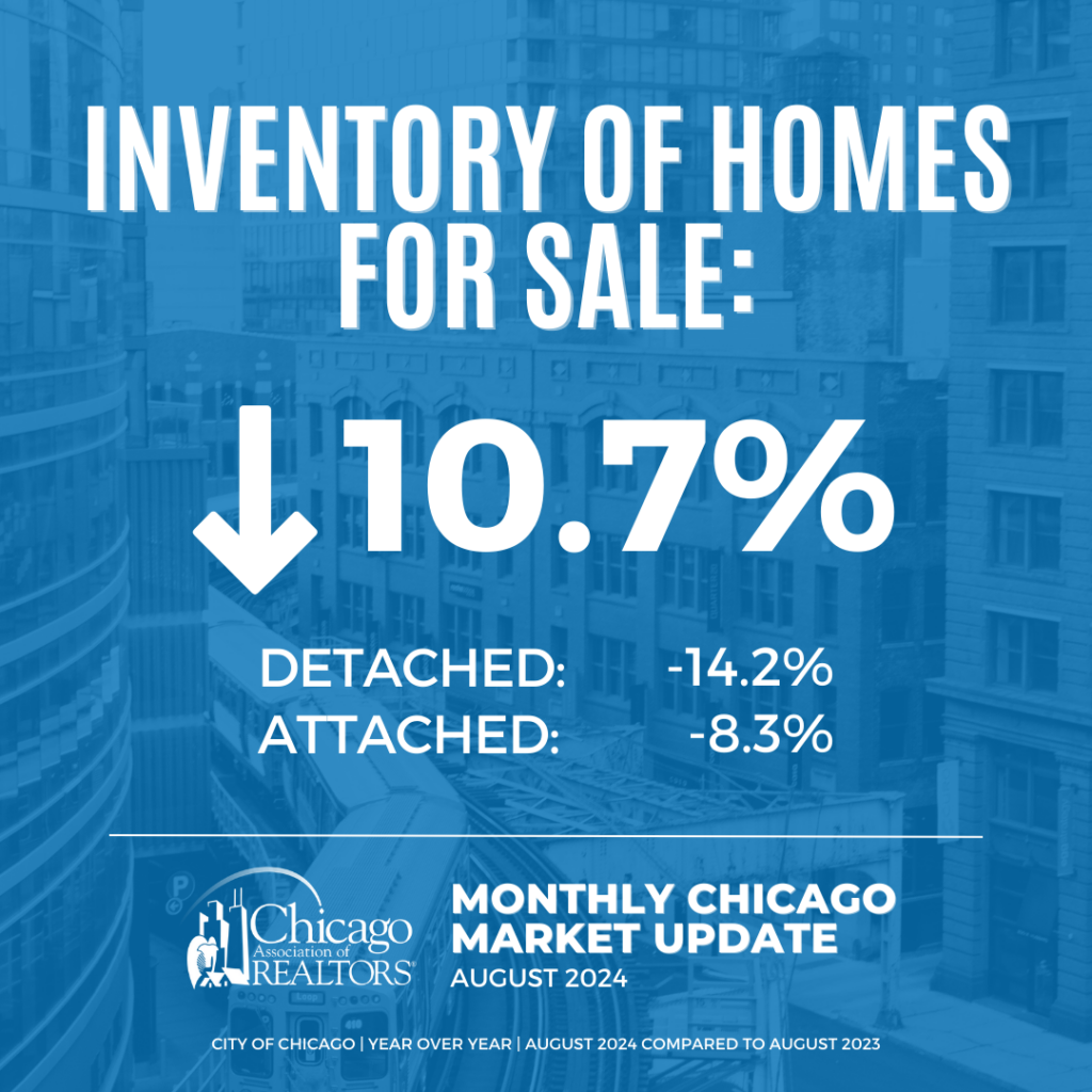 - The City of Chicago’s inventory is down 10.7%, from 5,985 homes in August 2023 to 5,344 homes in August 2024.