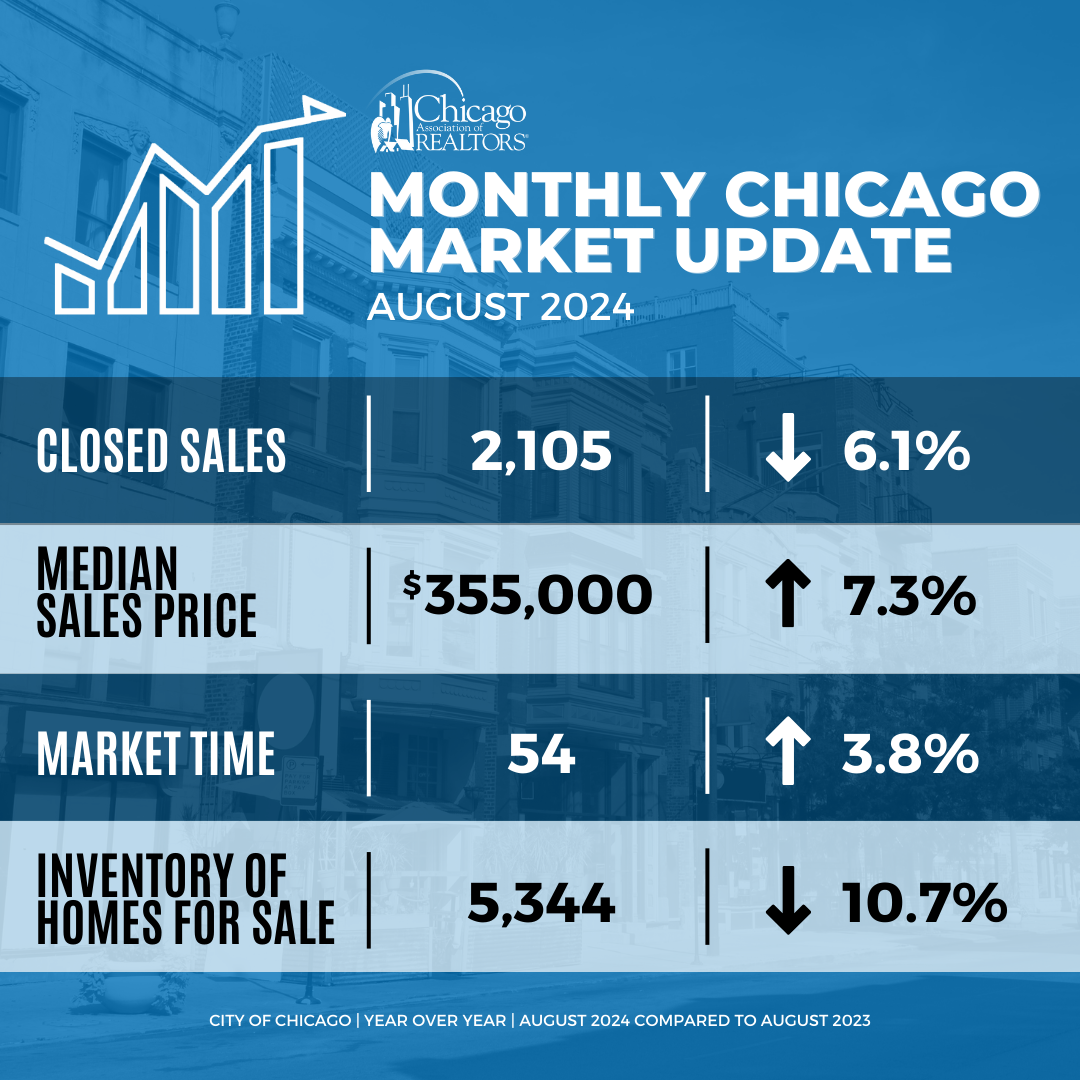 - The median sales price in the City of Chicago for August 2024 was $355,000, which is a 7.3% increase from August 2023.