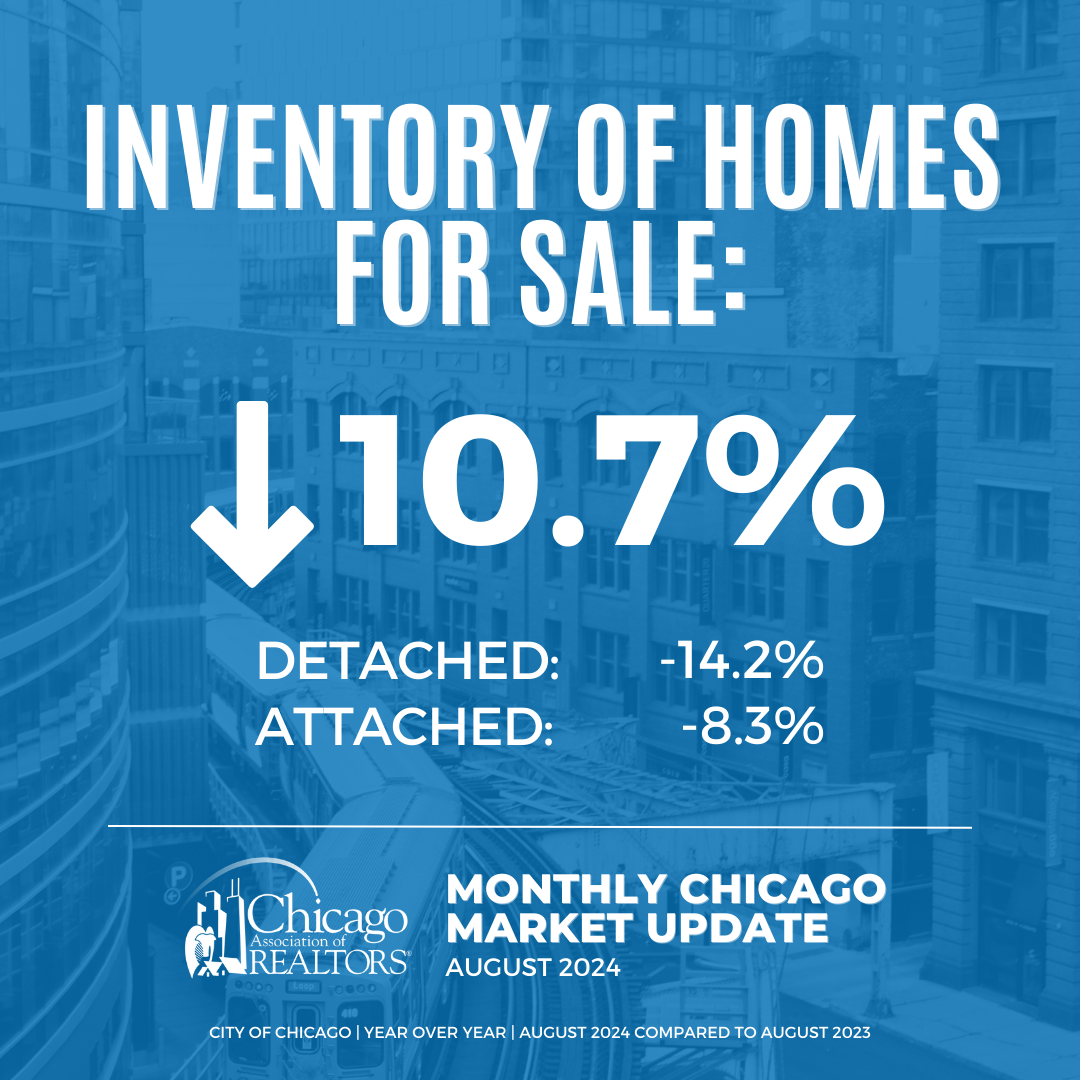 - The City of Chicago’s inventory is down 10.7%, from 5,985 homes in August 2023 to 5,344 homes in August 2024.