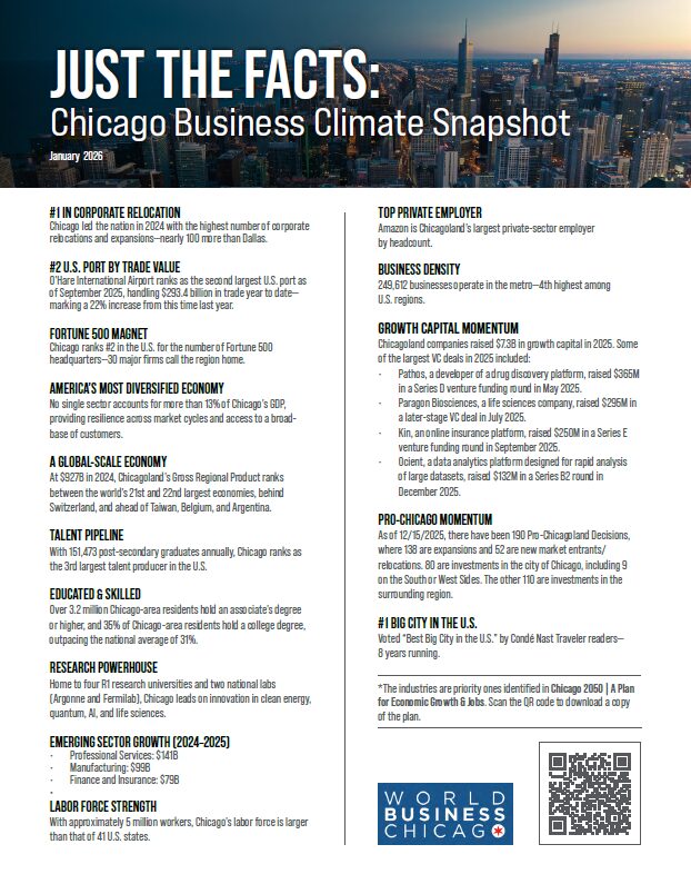 • Infrastructure: O’Hare International Airport, inland ports and a robust transportation network