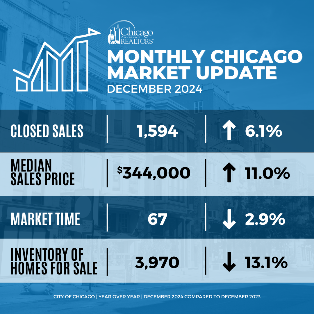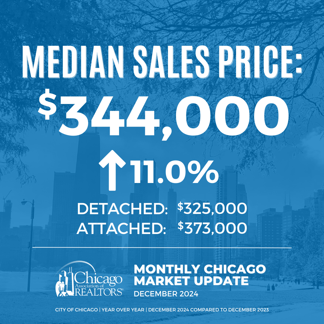 • The median sales price in the City of Chicago for December 2024 was $344,000, which is an 11.0% increase from December 2023.