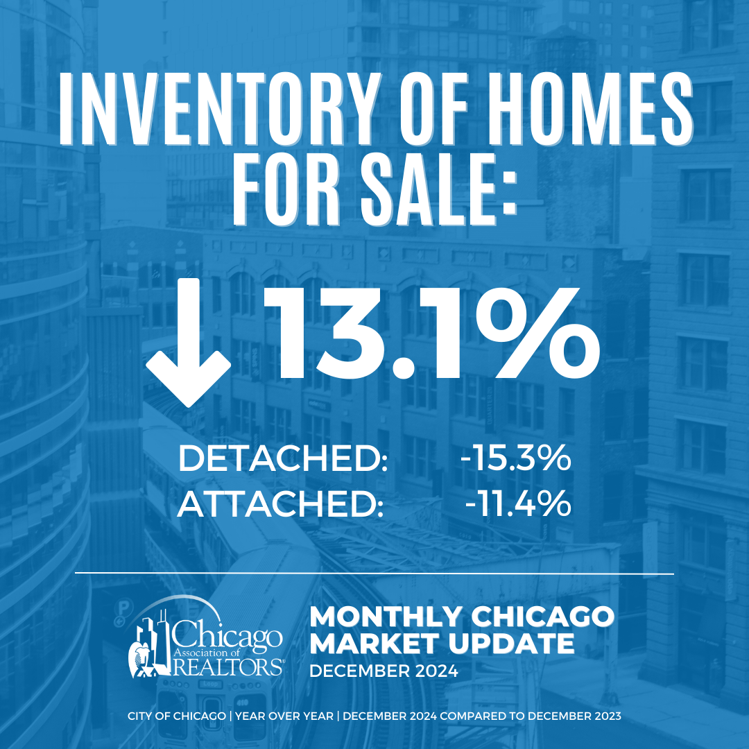 • The City of Chicago’s inventory is down 13.1%, from 4,570 homes in December 2023 to 3,970 homes in December 2024.