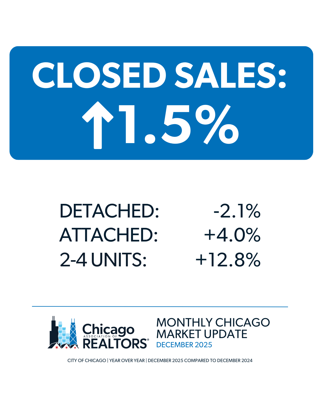 • 1,633 properties were sold in the City of Chicago in December 2025. This is an 1.5% increase from December 2024.
