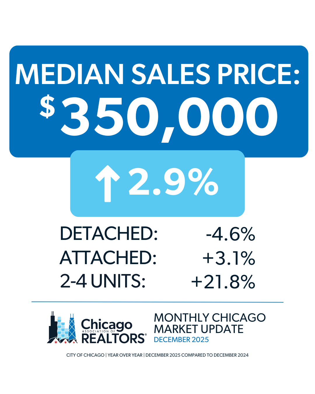 • The median sales price in the City of Chicago for December 2025 was $350,000, which is a 2.9% increase from December 2024.