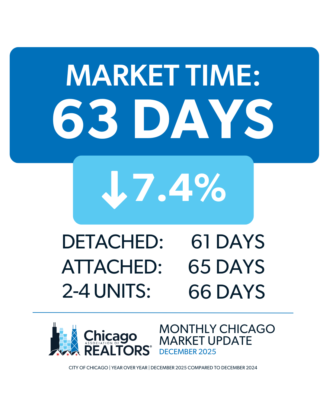 • The City of Chicago saw listings average 63 days on the market until contract, which is a 7.4% decrease from December 2024.