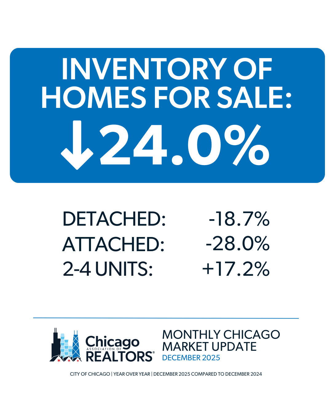 • The City of Chicago’s inventory is down 24.0%, from 4,001 homes in December 2024 to 3,040 homes in December 2025.