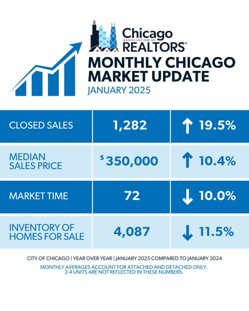 • The median sales price in the City of Chicago for January 2025 was $350,000, which is a 10.4% increase from January 2024.