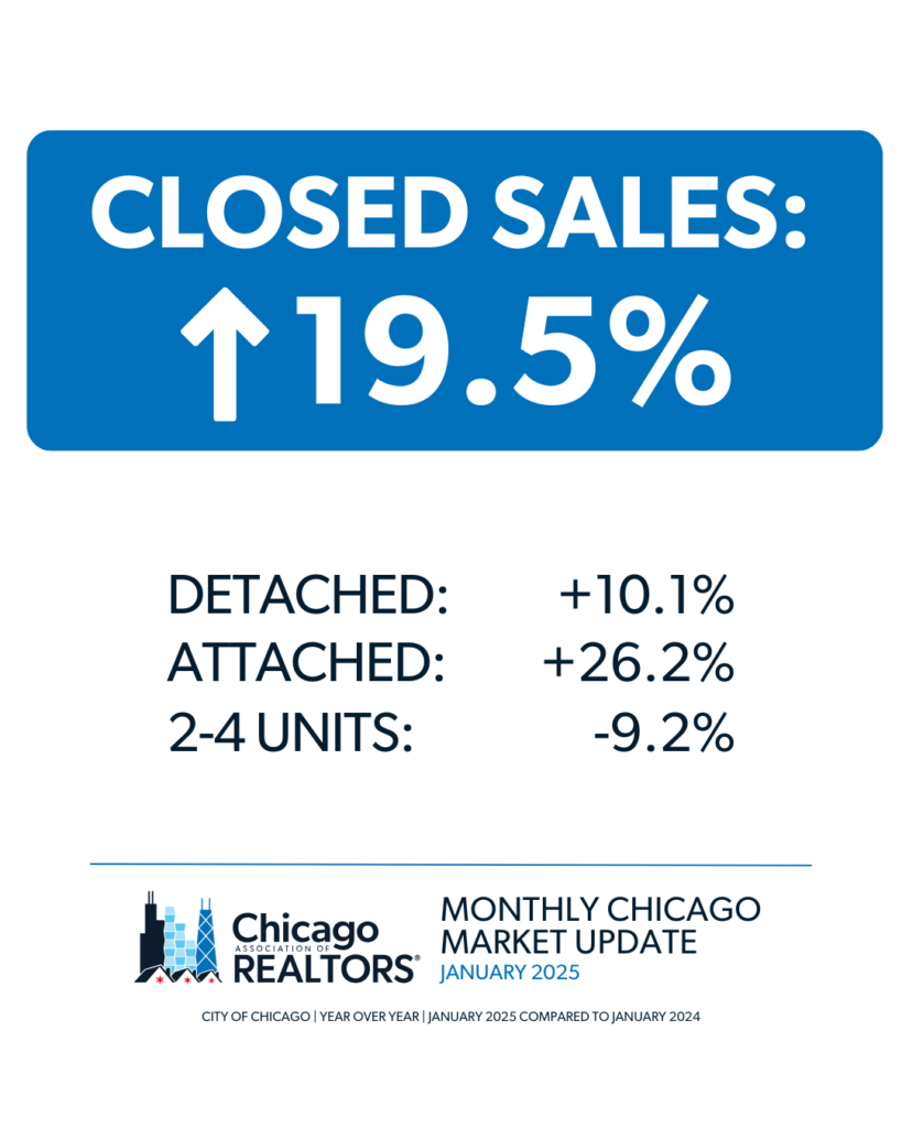• 1,282 properties were sold in the City of Chicago in January 2025. This is a 19.5% increase from January 2024.