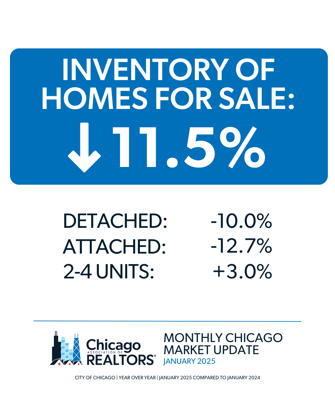 • The City of Chicago’s inventory is down 11.5%, from 4,620 homes in January 2024 to 4,087 homes in January 2025.