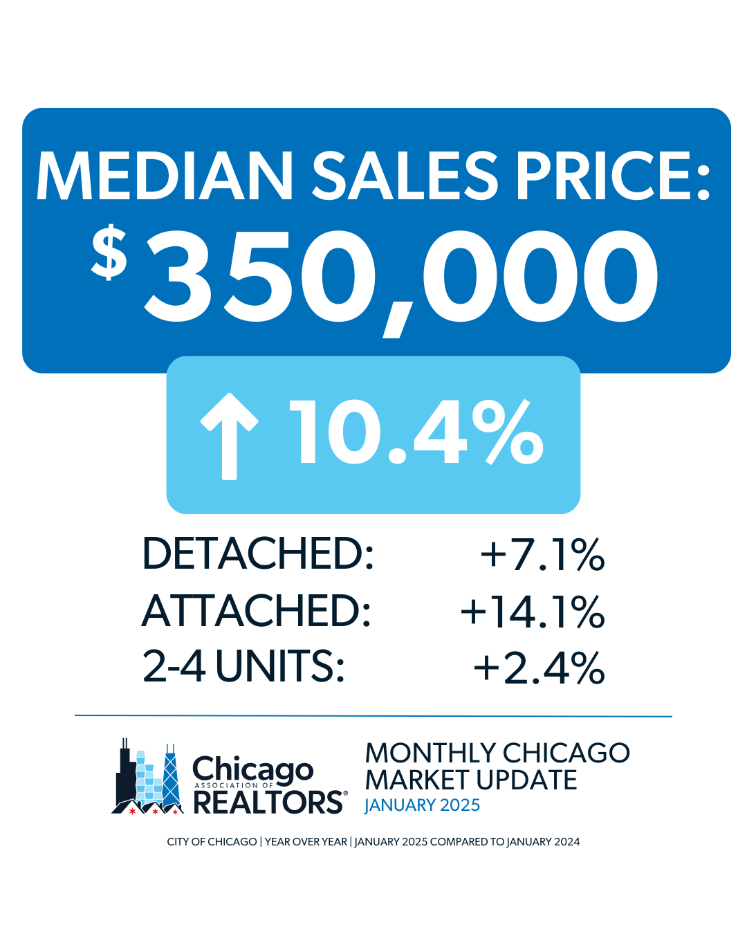• The median sales price in the City of Chicago for January 2025 was $350,000, which is a 10.4% increase from January 2024.
