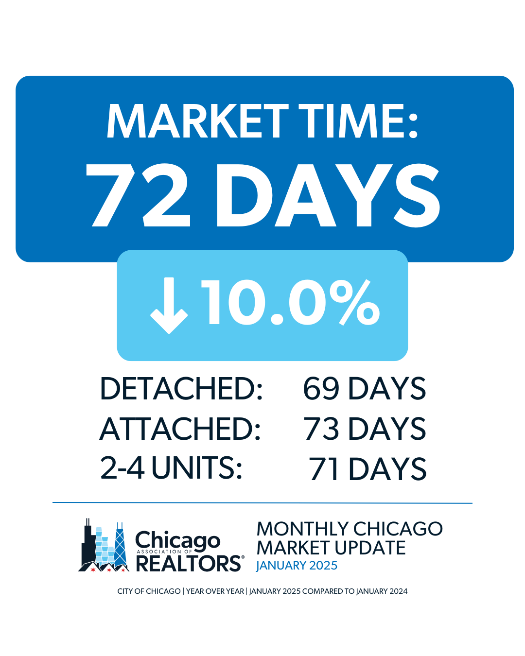 • The City of Chicago saw listings average 72 days on the market until contract, which is a 10.0% decrease from January 2024.