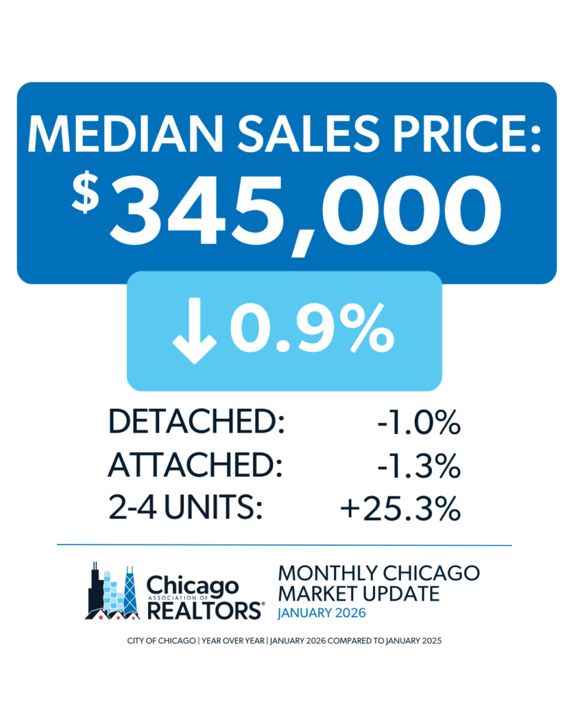 • The median sales price in the City of Chicago for January 2026 was $345,000, which is a 0.9% decrease from January 2025.