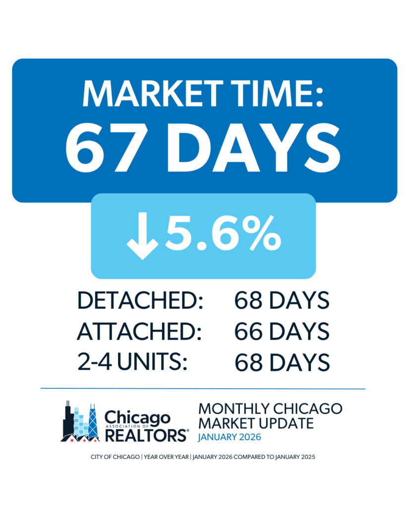 • The City of Chicago saw listings average 67 days on the market until contract, which is a 5.6% decrease from January 2025.