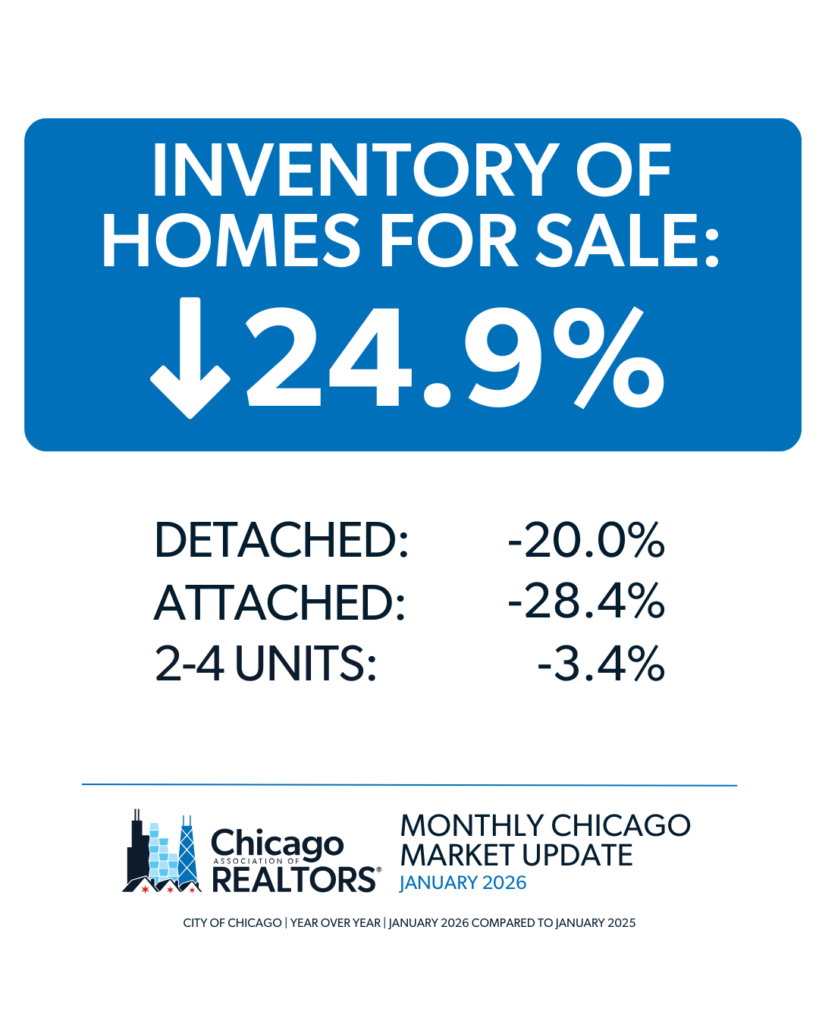 • The City of Chicago’s inventory is down 24.9%, from 4,097 homes in January 2025 to 3,078 homes in January 2026.