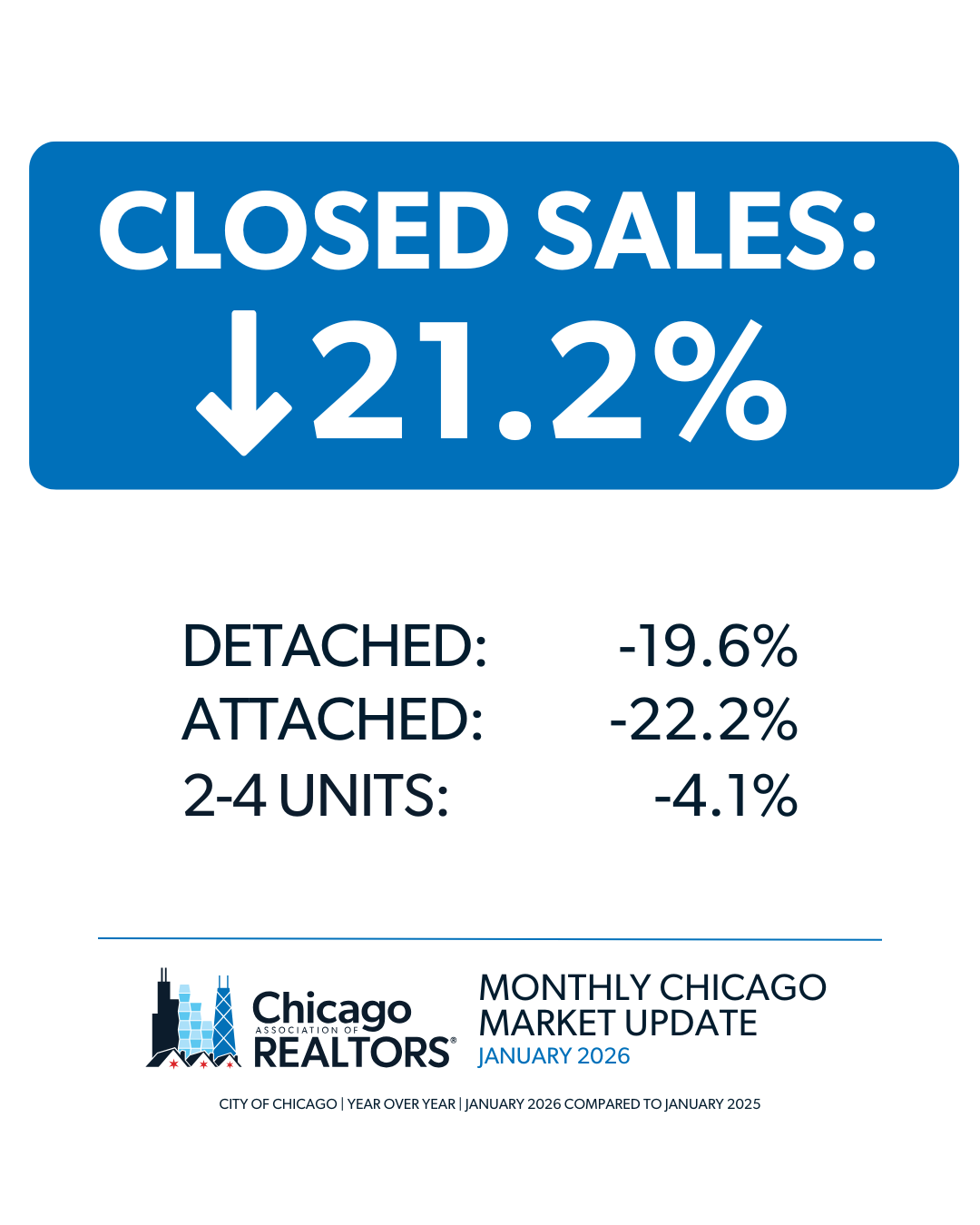 • The median sales price in the City of Chicago for January 2026 was $345,000, which is a 0.9% decrease from January 2025.