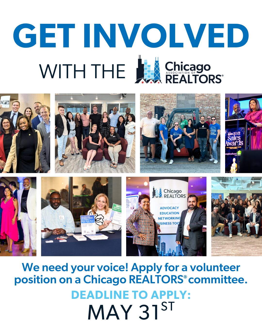 Gain leadership experience and help shape the future of our industry as a Chicago Association of REALTORS® volunteer. I serve on the Chicago Association of REALTOR’S® [INSERT COMMITTEE NAME HERE]. Join me next year! The deadline to apply is May 31st. https://chicagorealtor.com/membership/get-involved/