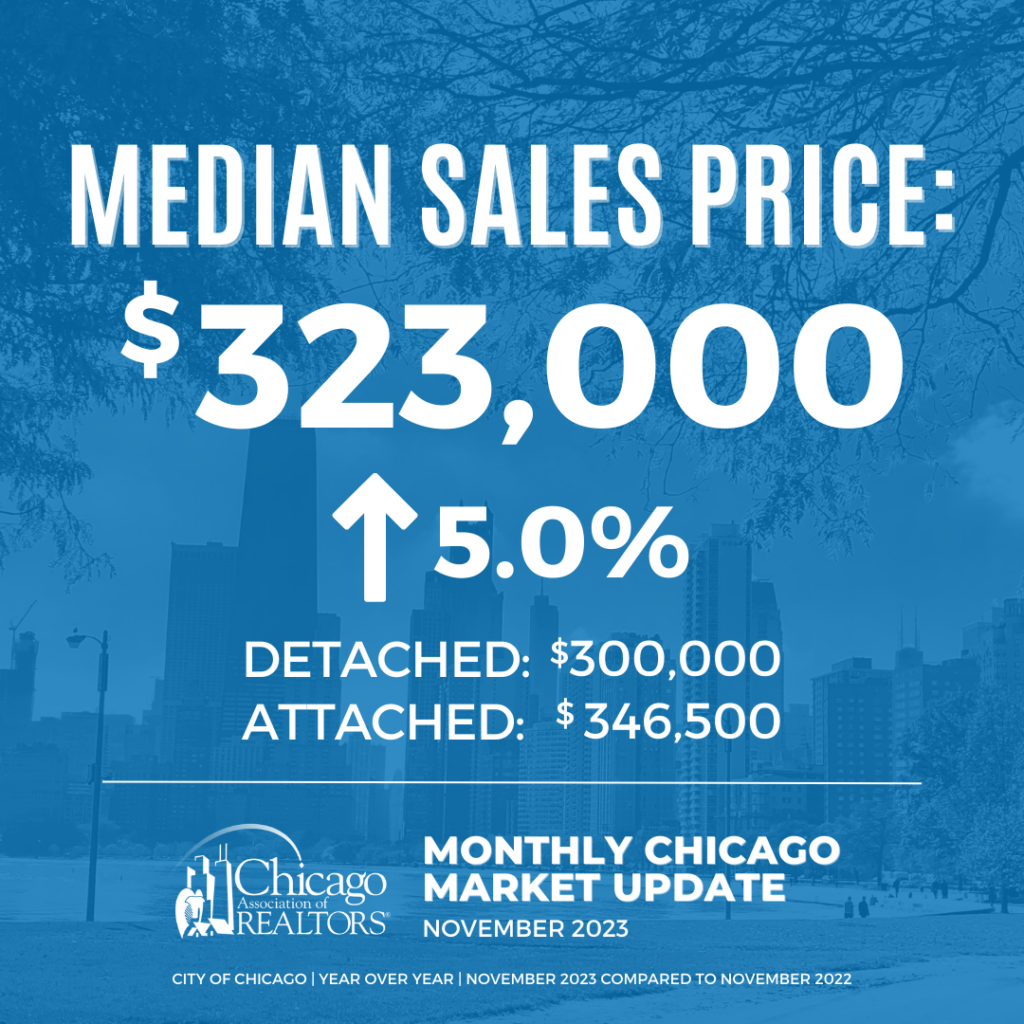 - The median sales price in the City of Chicago for November 2023 was $323,000, which is a 5.0% increase from November 2022.