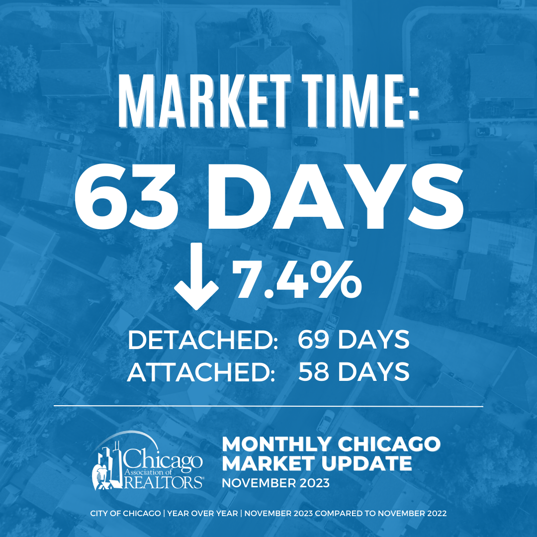 - The City of Chicago saw listings average 63 days on the market until contract, which is a 7.4% decrease from November 2022.