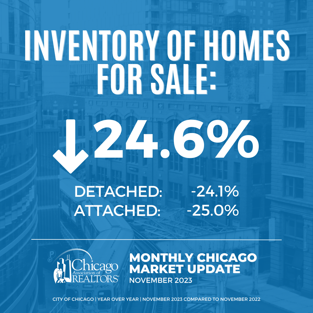 - The City of Chicago’s inventory is down 24.6%, from 6,980 homes in November 2022 to 5,260 homes in November 2023.