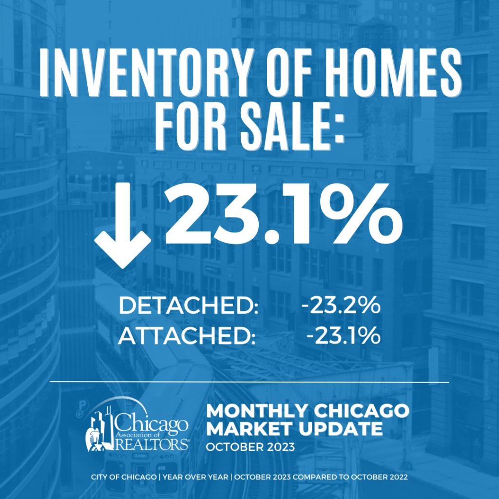 • The City of Chicago’s inventory is down 23.1%, from 7,607 homes in October 2022 to 5,846 homes in October 2023.