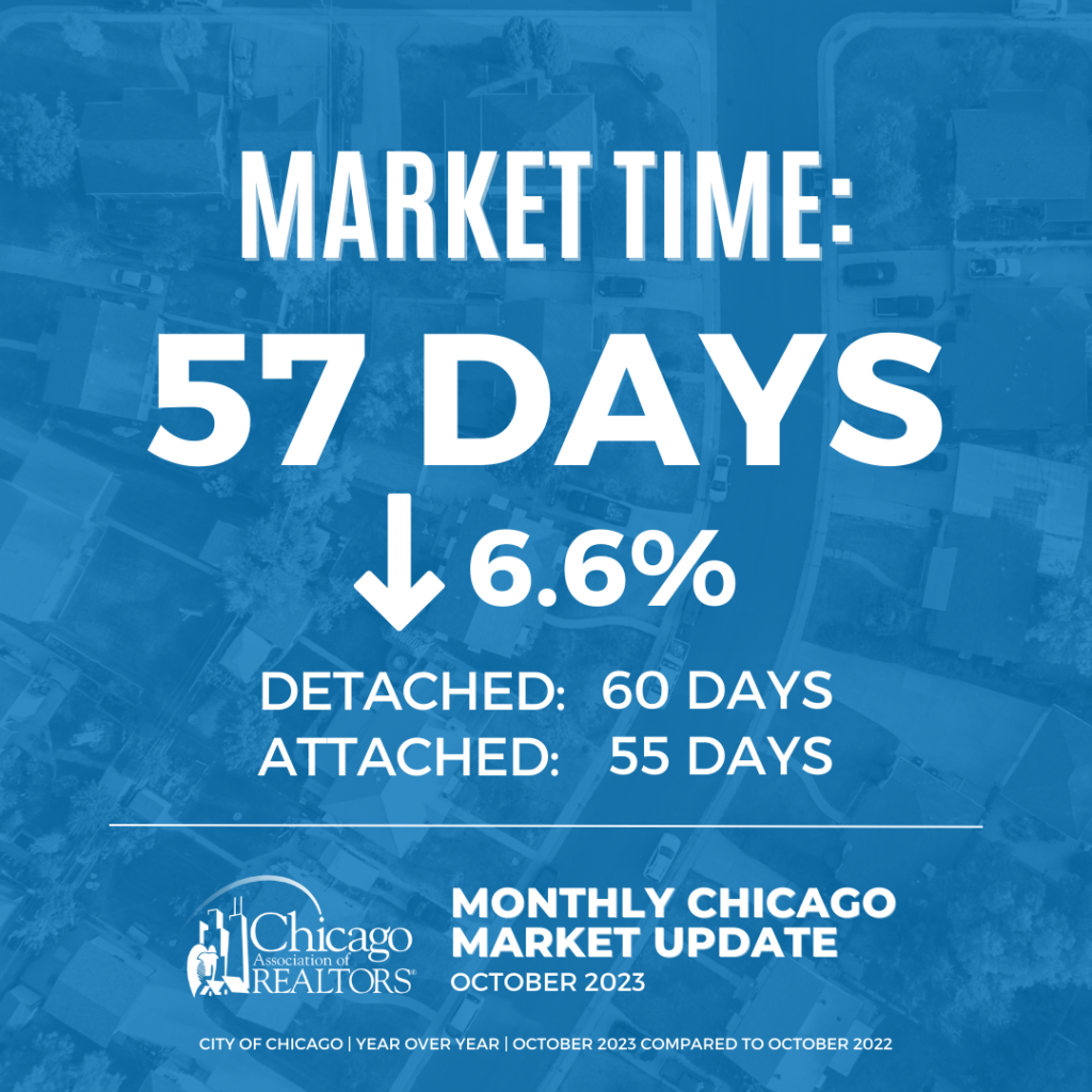 • The City of Chicago saw listings average 57 days on the market until contract, which is a 6.6% decrease from October 2022.