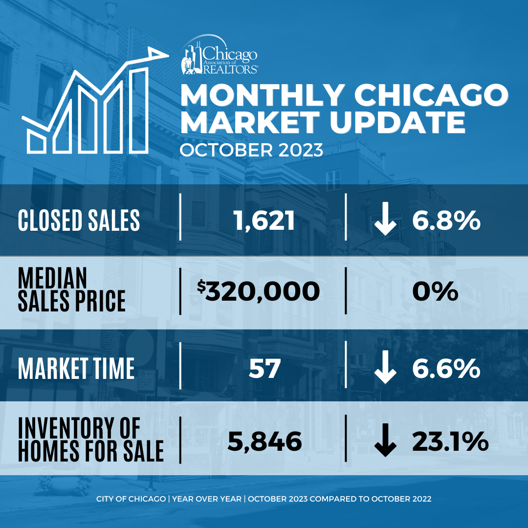 • The median sales price in the City of Chicago for October 2023 was $320,000, which is the same as October 2022.